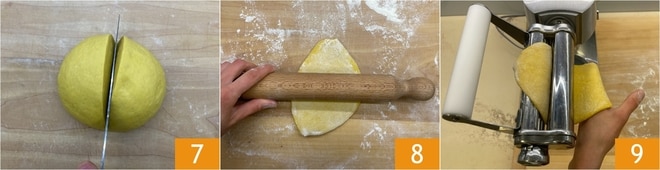 Após o tempo de descanso, divida o bloco ao meio 7 e achate uma das partes com o rolo de massa na bancada enfarinhada 8, depois passe-a entre os rolos da máquina de massa na espessura mais larga 9; lembre-se de embrulhar em filme plástico a parte da massa que não está usando para evitar que seque.
