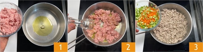 Para preparar o talharim palha e feno com ragu de coelho, primeiro faça um picadinho com cenoura, aipo e cebola. Aqueça em uma panela um fio de azeite com um dente de alho, depois adicione a carne moída de coelho 1, sal e pimenta 2. Doure a carne em fogo médio-alto por 5 minutos. Em seguida, adicione o picadinho de legumes 3 e continue a dourar por mais 5 minutos.