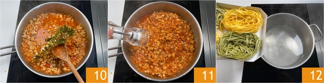 Neste ponto, retire as ervas aromáticas 10 e ajuste o sal e a pimenta 11. Cozinhe o talharim palha e feno em água fervente com sal 12.