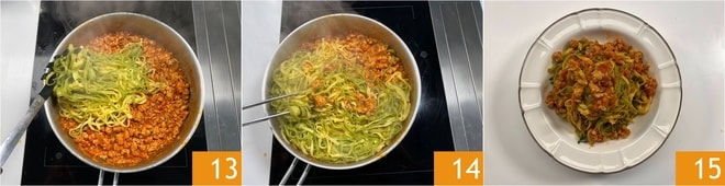 Escorra e transfira diretamente para o molho 13. Misture bem 14 e sirva. Complete com uma pitada de pimenta e algumas folhas de tomilho. Seu talharim palha e feno está pronto para ser servido 15!