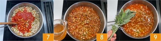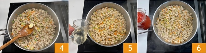 Agora, retire o dente de alho 4 e adicione o vinho branco 5. Quando o álcool evaporar completamente, você poderá adicionar o molho de tomate 6.