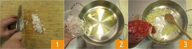 Para preparar o tamboril em guazzetto, comece preparando o molho. Limpe e pique a chalota 1. Em uma panela, coloque a chalota finamente picada, o óleo e o alho 2. Refogue a chalota em fogo baixo por cerca de 5-6 minutos. Despeje o purê de tomate 3