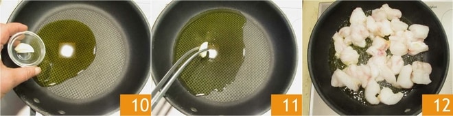 Em outra panela, coloque um fio de óleo e o alho, aqueça em fogo baixo para dar sabor 10. Retire o alho 11 e coloque os pedaços de tamboril 12.