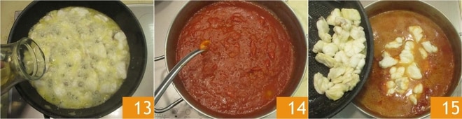 Regue com o vinho branco 13 e deixe evaporar. Enquanto isso, remova o dente de alho do molho 14 e adicione o peixe 15.