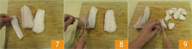 e remova a espinha central 7. Retire os resíduos de pele 8 e corte em pedaços do mesmo tamanho, cerca de dois centímetros 9.