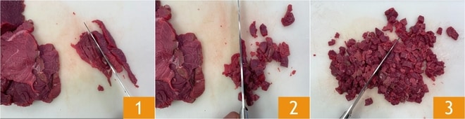 Para preparar a tartare de carne bovina, primeiro limpe a carne de eventuais nervuras e partes gordurosas, depois corte-a primeiro em tiras 1 e depois em cubos de meio cm 2. Quem desejar uma textura mais fina pode picar a carne com a ponta da faca 3.