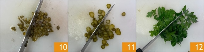 Pique também as alcaparras dessalgadas 10, os picles 11 e a salsinha 12.