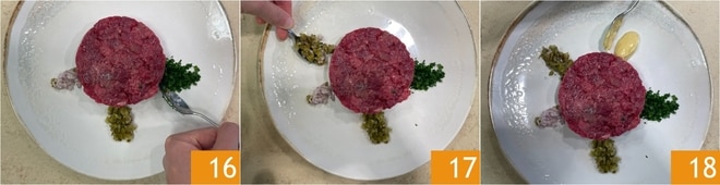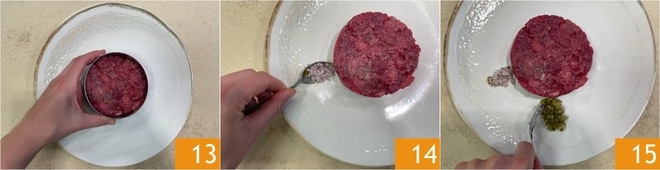 Você está pronto para empratar: use um aro de metal para dar à carne a forma de um medalhão 13, depois complete o prato com os condimentos, formando queneles com a ajuda de 2 colheres de chá. Adicione então a chalota 14 e os picles 15.