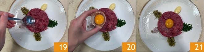 Finalmente, com a ponta da colher de chá, crie uma cavidade na superfície da tartare 19 e deixe escorregar delicadamente uma gema no centro 20. Sua tartare de carne bovina está pronta para ser servida 21!