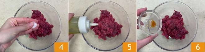 Transfira a carne para uma tigela e tempere com sal 4, pimenta, azeite 5 e tabasco 6.