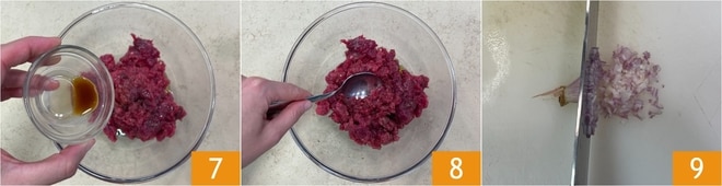 Adicione o molho Worcestershire 7 e misture 8. Agora limpe e pique a chalota 9.