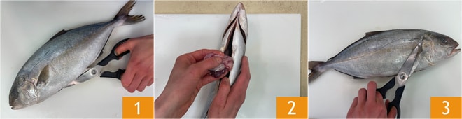 Para preparar o xaréu ao estilo mediterrâneo, primeiro certifique-se de ter mantido o peixe no freezer por pelo menos 96 horas, ou compre-o já abatido. Em seguida, dedique-se à limpeza do peixe. Faça um corte no ventre 1, remova as vísceras 2 e enxágue em água corrente para eliminar todas as impurezas. Corte as barbatanas laterais 3.