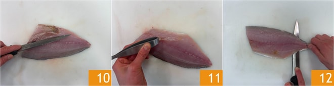 Remova a parte inferior da barriga, aparando-a com uma faca 10. Com uma pinça, retire os espinhos e as partes mais vermelhas 11 que, cruas, podem resultar um pouco amargas. Segure o filé pela parte da cauda, faça uma incisão e deslize a faca para remover a pele 12. Você obterá 2 filés de cerca de 120 g cada.
