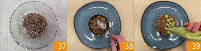 Quando todos os ingredientes estiverem perfeitamente misturados 37, monte o prato com a ajuda de um aro de metal 38. Enfeite com o creme de abacate 39.