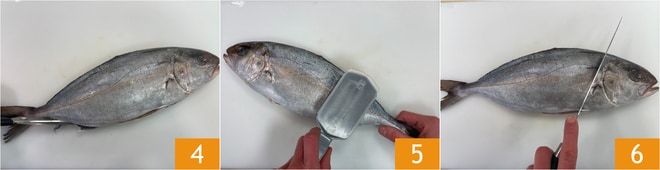 Remova também as barbatanas situadas no dorso e no ventre 4. Escame com o utensílio apropriado 5, ou com o dorso de uma faca. Faça um corte diagonal, logo após as guelras, que comece no dorso e se encontre com o corte feito anteriormente no ventre 6.