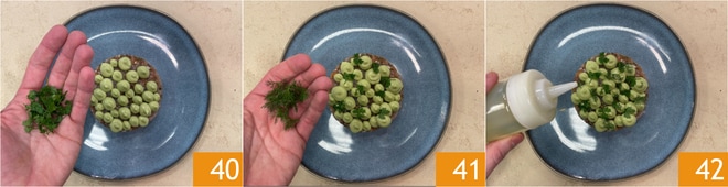 Adicione cerefólio picado 40, endro 41 e finalize com um fio de óleo 42. A tartare de xaréu ao estilo mediterrâneo está pronta para ser servida!