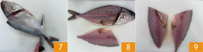 Faça um corte na cauda e na parte dorsal do peixe seguindo a coluna vertebral 7, uma vez retirado o primeiro filé 8, proceda da mesma forma para o segundo 9.