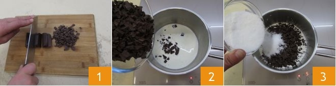 Para preparar a trufa gelada, comece fazendo o sorvete de chocolate. Pique finamente o chocolate amargo e reserve 1. Despeje o creme de leite em uma panela e aqueça até quase ferver, depois tire do fogo e adicione o chocolate 2 e o açúcar 3 na panela.