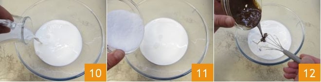 Enquanto isso, prepare também o sorvete de avelã. Despeje em uma tigela o leite, o creme de leite 10, o açúcar 11 e a pasta de avelã 12.