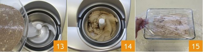 Misture tudo com um batedor até incorporar os ingredientes e despeje a mistura na sorveteira 13 e deixe-a girar por 30 minutos, até obter uma mistura bem cremosa 14. Transfira o sorvete de avelã para uma travessa baixa, cubra com filme plástico 15 e coloque no freezer por pelo menos 2 horas.
