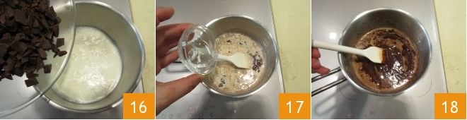 Agora, prepare a ganache de chocolate amargo, que será o coração da sua trufa gelada. Pique grosseiramente o chocolate amargo, despeje o creme de leite em uma panela e aqueça até quase ferver em fogo baixo. Desligue o fogo, adicione o chocolate no creme quente 16 e acrescente a glicose 17. Em seguida, misture tudo até obter uma mistura uniforme 18.
