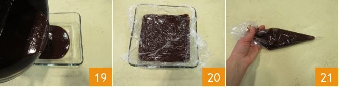 Transfira a ganache de chocolate para uma travessa 19 e cubra com filme plástico em contato 20. Deixe esfriar em temperatura ambiente, transfira para um saco de confeitar e coloque na geladeira para firmar 21.