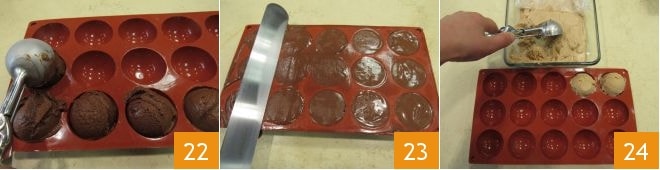 Pegue a forma de silicone (de 460 g) e preencha as meias-esferas com uma bola de sorvete de chocolate 22, nivele com a ajuda de uma espátula 23 e coloque no freezer por mais uma hora. Pegue outra forma e, novamente com a ajuda de um boleador, preencha as meias-esferas com o sorvete de avelã 24.