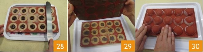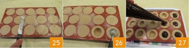 Nivele a superfície 25 e coloque também no freezer por uma hora. Após esse tempo, retire do freezer e com um boleador crie a cavidade 26 e preencha com a ganache de chocolate 27.