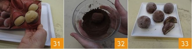 Retire a forma do freezer no momento de servir sua trufa gelada. Desenforme delicadamente as esferas: faça uma leve pressão sobre as duas formas simultaneamente para liberar cada trufa gelada 31 e passe no cacau 32. Coloque as trufas em um prato de servir e sirva 33.
