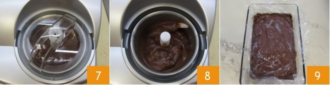 Uma vez frio, despeje a mistura de chocolate na sorveteira 7 e deixe-a girar por 35 minutos, até obter uma mistura bem cremosa 8. Em seguida, transfira o sorvete de chocolate para uma travessa baixa, cubra com filme plástico 9 e coloque no freezer por pelo menos 2 horas.