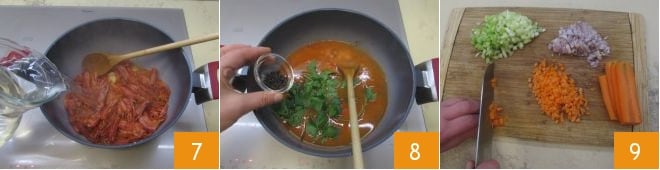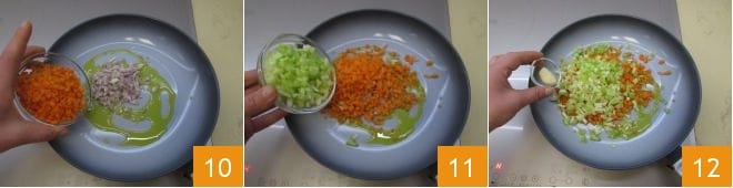 Em uma frigideira antiaderente, despeje o óleo e adicione a mistura de cenouras 10, cebola échalote, aipo 11 e alho 12.
