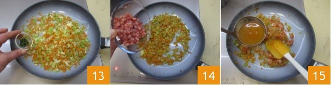 Adicione então o tomilho 13 e deixe dourar todos os ingredientes por cerca de 6-7 minutos. Quando estiverem bem dourados, adicione os camarões em pedaços (reserve cerca de 80 gramas) 14 e cozinhe por alguns minutos; adicione cerca de 50-60 gramas do caldo de peixe que você preparou 15.