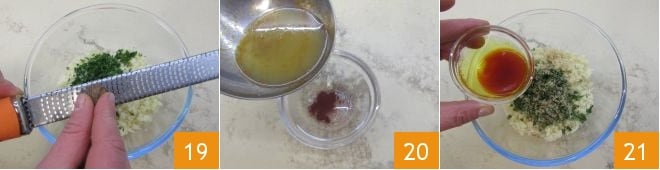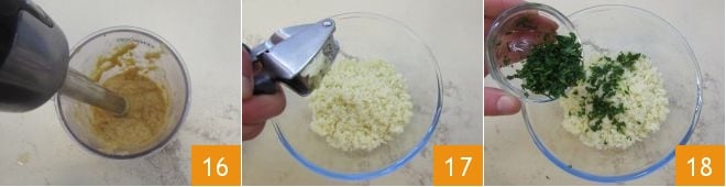Ajuste o sal e a pimenta e deixe cozinhar por 3-4 minutos. Desligue e transfira os legumes para uma tigela alta, batendo com um mixer até obter uma mistura cremosa e homogênea 16. Reserve a mistura. Agora pegue outra tigela e coloque a miolo de pão, triture e adicione o alho amassado 17, a salsa finamente picada 18