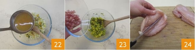 despeje mais 30 gramas de caldo 22; ajuste o sal e a pimenta. Em seguida, adicione à mistura os camarões crus restantes, cortados em pequenos pedaços 23 e misture bem: esta mistura será o recheio dos seus bolsos de frango. Passe agora para a preparação dos peitos de frango: faça uma incisão no peito de frango seguindo a linha horizontal natural que atravessa o centro, sem cortá-la completamente, obtendo assim um bolso 24.