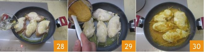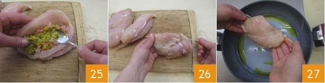 Recheie os peitos com o recheio que obteve não triturado 25 e feche seus bolsos com palitos de dente longos para que a mistura interna não saia 26. Então pegue uma frigideira e despeje um fio de óleo. Coloque os bolsos de frango e doure-os de ambos os lados 27.
