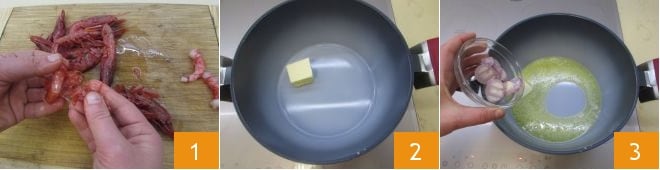 Para preparar os bolsos de frango recheados com camarões, comece pela preparação do caldo de camarões. Pegue os camarões e lave-os em abundante água, remova o carapaça, a cauda, as patas e a cabeça 1. Em seguida, proceda eliminando o intestino com um palito de dente (você pode consultar a escola de cozinha: como limpar os camarões). Coloque os camarões limpos em uma tigela coberta com filme plástico na geladeira e guarde os carapaças. Pegue então a cebola échalote, descasque-a e corte em fatias finas. Em uma panela, derreta a manteiga 2, depois adicione a cebola échalote 3