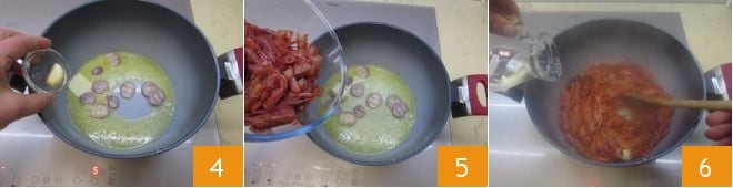 e o dente de alho 4. Refogue por 1 minuto, mexendo de vez em quando, e depois adicione as cabeças e os carapaças dos camarões 5. Despeje o vinho branco 6 e deixe evaporar, cozinhando em fogo baixo.