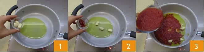 Para preparar a assadeira de bacalhau à napolitana, primeiro cozinhe o molho de tomate: em uma panela com um pouco de azeite, doure o alho descascado 1, depois adicione a pimenta malagueta picada 2 e após alguns minutos de refogado, adicione a polpa de tomate 3 e deixe cozinhar por cerca de 15 minutos.