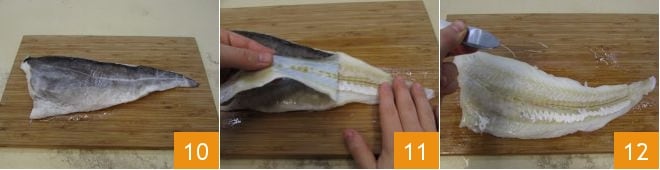 Enquanto isso, pegue o bacalhau 10 já dessalgado (se estiver salgado, deixe-o na água por 3 dias, trocando a água 2 ou 3 vezes ao dia para dessalgá-lo), retire a pele 11 e retire as espinhas com a ajuda de uma pinça.