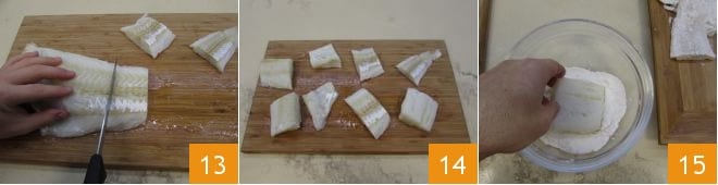 Corte-o 13 até obter 8 pedaços 14, depois, em uma tigela com farinha, enfarinhe bem cada lado, sacudindo o excesso de farinha batendo-o delicadamente contra as bordas da tigela onde colocou a farinha.