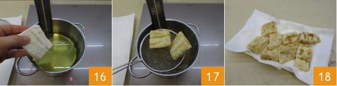 Em uma panela pequena, despeje o óleo de sementes e aqueça até atingir a temperatura de 180°-190°, depois frite os pedaços de bacalhau e, para evitar que a temperatura do óleo caia repentinamente, frite 2 pedaços de cada vez, por cerca de 2-3 minutos, dependendo da espessura. Assim que estiverem prontos, escorra-os em papel absorvente 18.