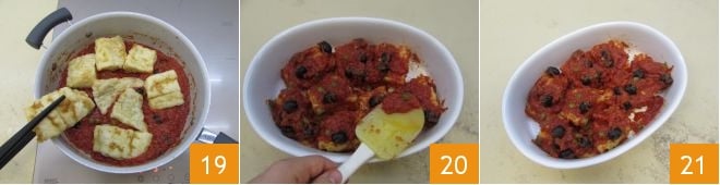 Adicione o bacalhau ao molho na panela 19, deixe pegar sabor por alguns minutos, em seguida, transfira a mistura para um refratário 20 cobrindo o bacalhau com o tomate e finalize o cozimento em forno pré-aquecido a 160° por 20 minutos. Retire do forno, decore com salsinha picada e sua assadeira de bacalhau à napolitana está pronta para ser servida! 21