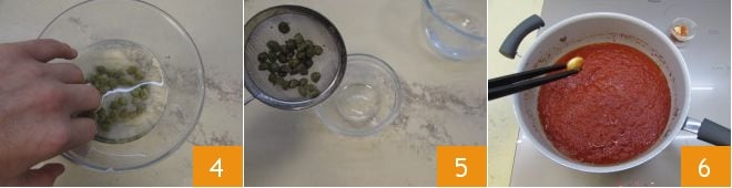 Enquanto isso, dessalgue as alcaparras mergulhando-as em uma tigela com água fria 4 e depois escorra-as 5, aguardando para adicioná-las na panela. Quando o molho estiver no ponto, retire o alho da panela 6,