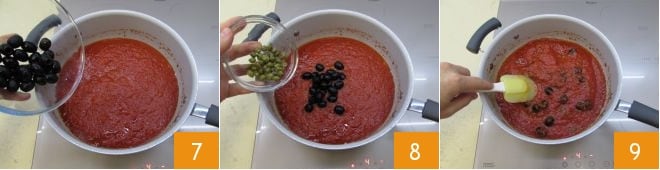 em seguida, adicione as azeitonas pretas 7 e as alcaparras 8 e misture tudo.