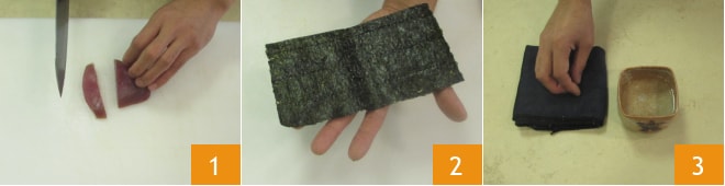 Para preparar o temaki, você deve ter o arroz para sushi quente no Ohitsu apropriado ou em um recipiente de madeira ou aço, deve usá-lo a uma temperatura de cerca de 36°. Prepare também uma tigelinha com água e um pouco de vinagre de arroz. Com uma faca bem afiada, faça um retângulo de 9 cm de comprimento e cerca de 1,5 cm de espessura a partir de um filé de atum 1. Pegue a meia folha de alga nori e posicione na mão esquerda com a superfície mais lisa e brilhante em contato com a palma. A mão onde está apoiada deve estar completamente seca 2. Molhe a mão direita na água acidulada e seque rapidamente em uma toalhinha 3.