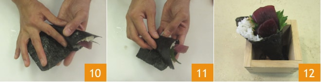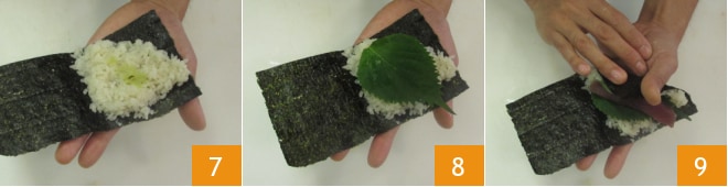 Adicione ao centro do arroz uma ponta de wasabi fresco 7, disponha a folha de shiso 8 e depois o retângulo de atum fresco, pousado sobre a folha de shiso, no canto superior esquerdo da folha de alga 9, de modo que uma vez enrolado uma parte fique para fora.