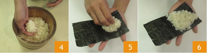 Com a mão direita pegue cerca de 50 g de arroz para sushi 4 e coloque na parte esquerda da alga 5, pressione delicadamente com os dedos para formar um triângulo 6.