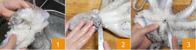 Para preparar os tentáculos de polvo com cuscuz à páprica, primeiro limpe o polvo: enxágue-o em água corrente 1 e remova os olhos 2 e o bico 3, depois remova as vísceras do interior do saco e enxágue novamente em água corrente.