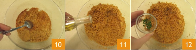 Após esse tempo, solte o cuscuz com um garfo ou colher 10, depois ajuste o sal e tempere com um fio de azeite 11 e algumas folhas de tomilho fresco 12. Reserve e deixe amornar.