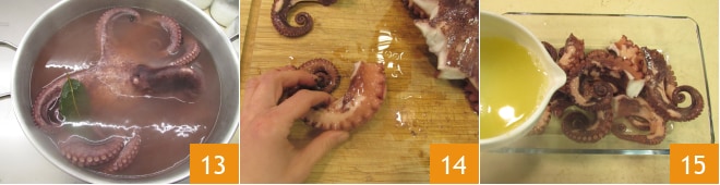 Quando o polvo estiver pronto 13, transfira-o para uma tábua de corte e corte os tentáculos, dividindo-os ao meio, se forem muito grossos 14. Coloque os tentáculos em uma assadeira onde você despejará o suco de limão 15,